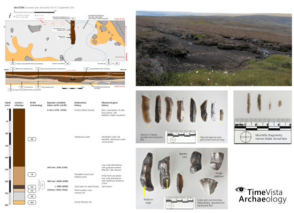 The current phase concerns an eroding blanket peat profile at Esklets site ECW6 which contains microliths and other diagnostic artefacts that are stratified at one level within the peat, rather than lying upon the mineral soil that underlies it as is almost always the case, and where the flints cannot be directly dated as there will have been a potentially long hiatus between flint deposition and peat formation. A few radiocarbon dates are available on charcoal from hearth features in the vicinity (site ECW2), but these dates are likely to be only approximate because of the ‘old wood’ effect, although some Quercus (oak) sapwood has been dated. The activity areas, noted since the 1950s here, are also in close proximity to an open-water wetland (during the Mesolithic) – also a rare occurrence in an upland.