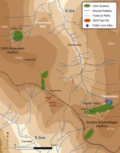 At almost every flint site the artefacts lie within or upon the mineral soil which underlies the blanket peat, with an hiatus of an unknown length of time between site occupation and the start of peat formation above them so that radiocarbon dating the base of the peat that seals the flint site would give a date later than the site’s occupation, perhaps by several hundred years or even much more. We also now know that many “sites” (artefact-based) are in fact palimpsest (overlapping, periodic, ‘favoured’ persistent places) multi-period activity areas spanning thousands of years, even in very small spaces, and therefore differing through time – socially and relationally.