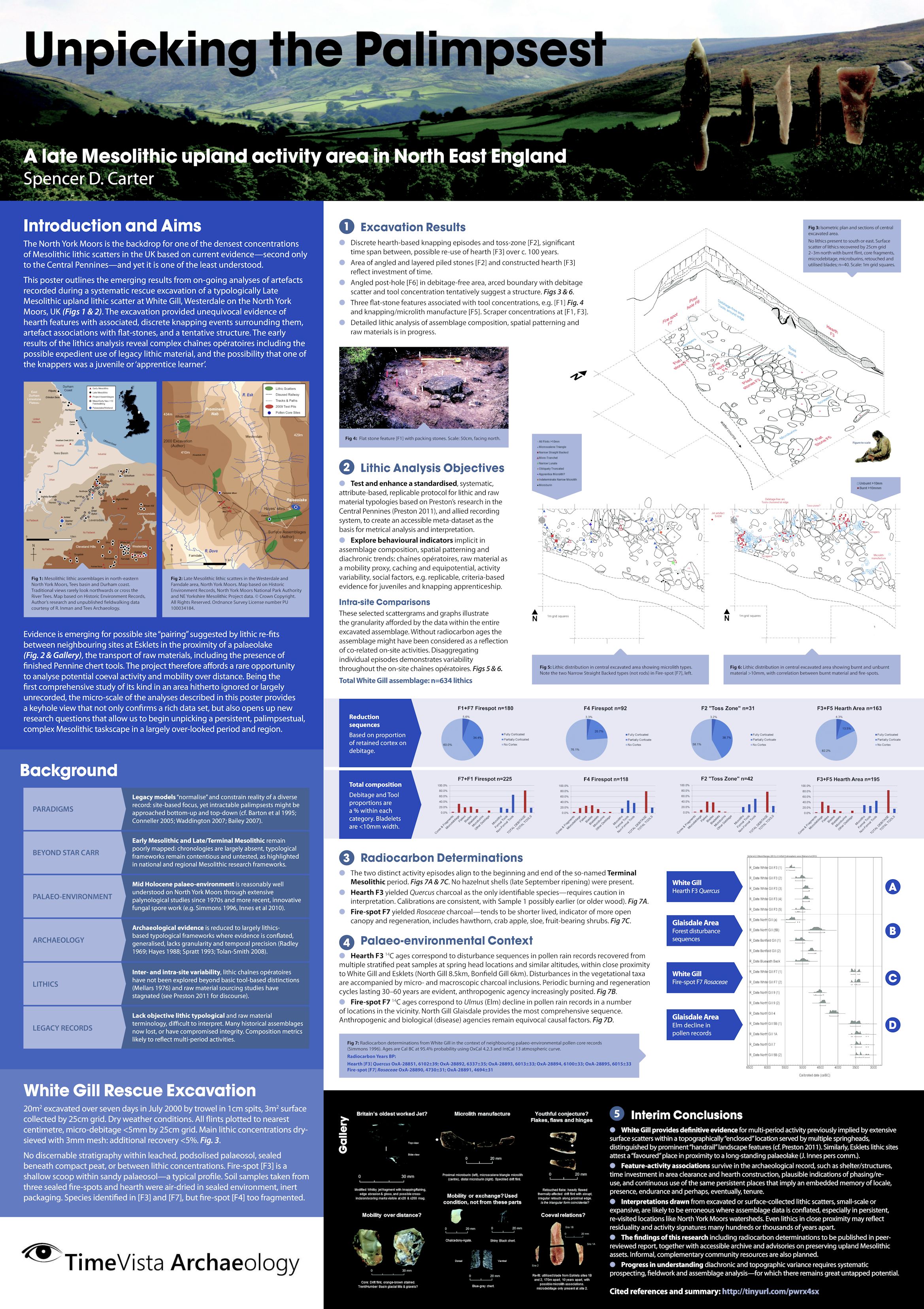 Carter, S.D. 2014. Unpicking the Palimpsest: a late Mesolithic upland activity area in North East England. Poster presentation at Where the Wild Things Are: Recent Advances in Palaeolithic and Mesolithic Research Conference, 8-10 Jan 2014, University of Durham [Online paper: academia.edu, includes handout with bibliography*].