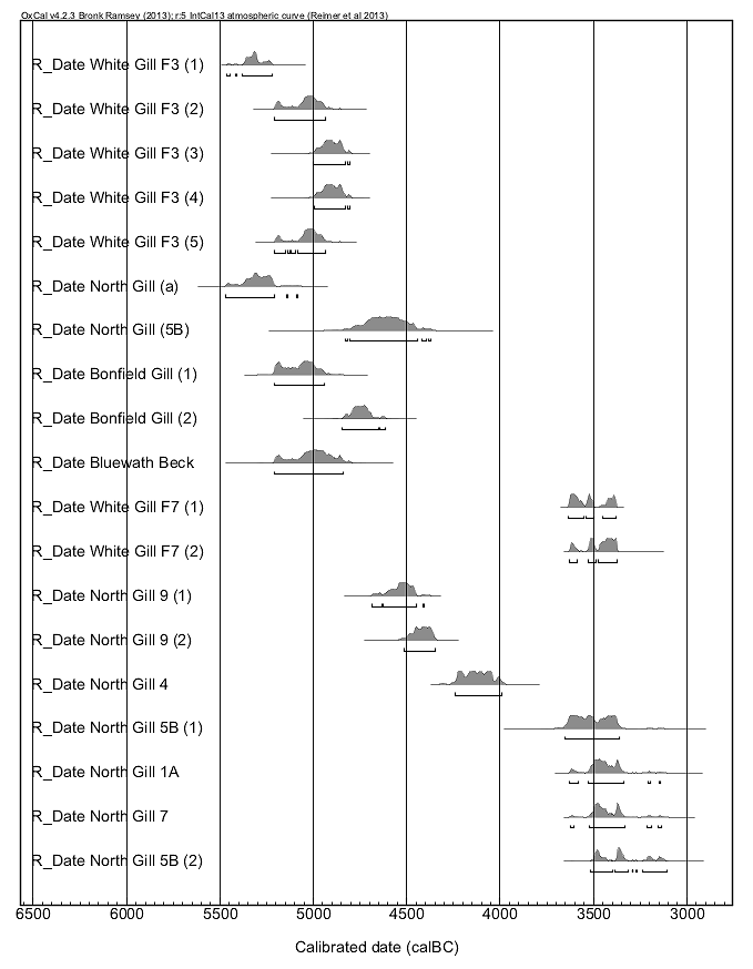 * Please note that the most recent radiocarbon determinations from White Gill (corylus avellana) are not included, pending Bayesian modeling and further analysis of the lithic material culture. The very latest dates are at c 3780 cal BC and overlap with dates from the earliest Neolithic at Street House, Loftus several kilometers away on the coast.