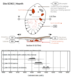The current phase concerns an eroding blanket peat profile at Esklets site ECW6 which contains microliths and other diagnostic artefacts that are stratified at one level within the peat, rather than lying upon the mineral soil that underlies it as is almost always the case, and where the flints cannot be directly dated as there will have been a potentially long hiatus between flint deposition and peat formation. A few radiocarbon dates are available on charcoal from hearth features in the vicinity (site ECW2), but these dates are likely to be only approximate because of the ‘old wood’ effect, although some Quercus (oak) sapwood has been dated. The activity areas, noted since the 1950s here, are also in close proximity to an open-water wetland (during the Mesolithic) – also a rare occurrence in an upland.